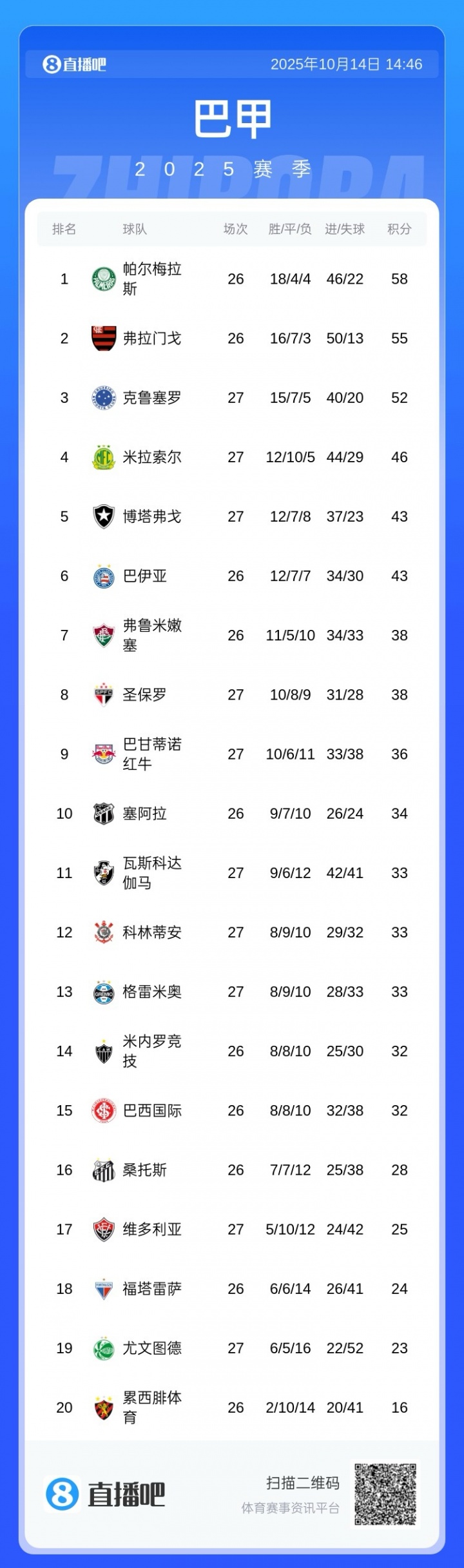 桑托斯目前在巴甲处境危急,26轮28分排名第16位,面临两年内第二次降级的严重风险。若桑托斯成功保级,内马尔大概率将留队;若再度降级,迈阿密国际的希望将重燃。