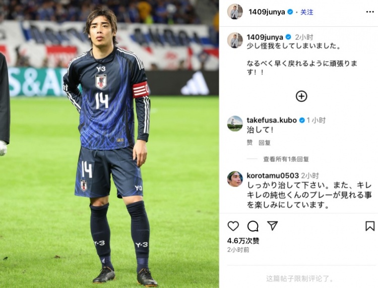 南野拓实、久保建英为这条社媒点赞,久保建英还送上祝福:“尽快康复!”