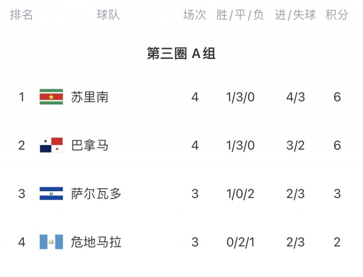 中北美世预赛A组第4轮:巴拿马1-1苏里南,萨尔瓦多0-1危地马拉