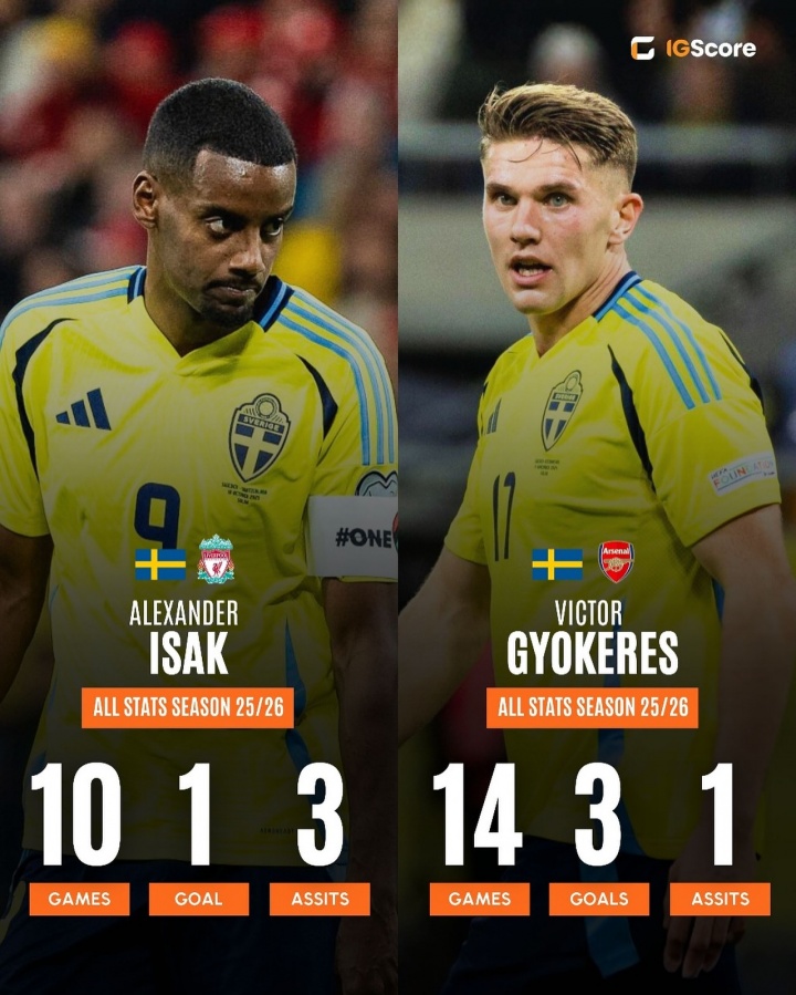 本赛季约克雷斯代表阿森纳和瑞典国家队出战14场比赛,贡献3粒进球和1次助攻,目前他的德转身价为7500万欧元;伊萨克则代表利物浦和瑞典出战10场比赛,贡献1粒进球和3次助攻,德转身价1.2亿欧元。