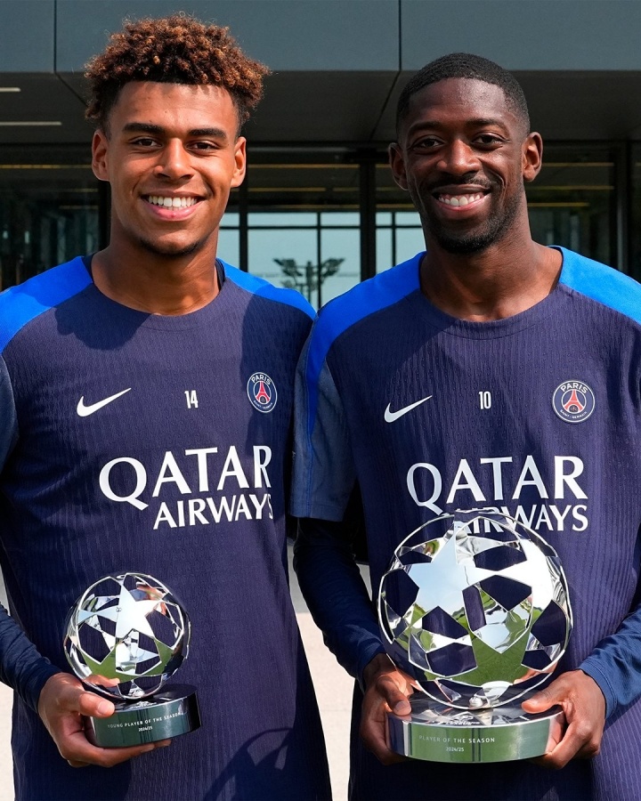 巴黎官方晒照,登贝莱、杜埃领取欧冠MVP、欧冠最佳年轻球员奖杯