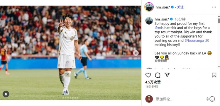 孙兴慜写道:“为我首个美国大联盟帽子戏法和队友们今晚的卓越表现感到无比开心与自豪,这场重要胜利要感谢所有球迷的推动力。”