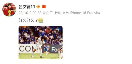 本场比赛海港老将吕文君在第64分钟替补登场。他赛后更新了个人社媒,晒出本场比赛照并写道:“好久好久了。”
