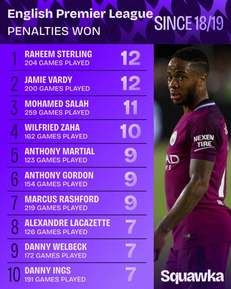 18-19赛季以来英超造点榜:斯特林、瓦尔迪12次最多,萨拉赫11次
