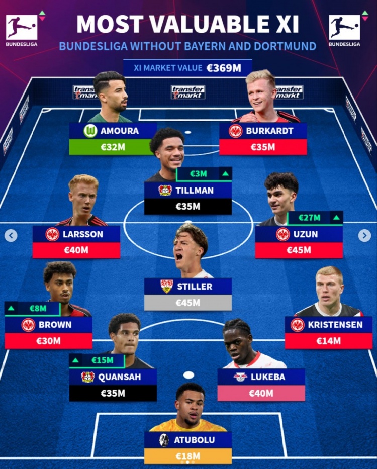 中场:詹-乌尊(法兰克福,4500万欧)、斯蒂勒(斯图加特,4500万欧)、雨果-拉尔森(法兰克福,4000万欧)、蒂尔曼(勒沃库森,3500万欧)