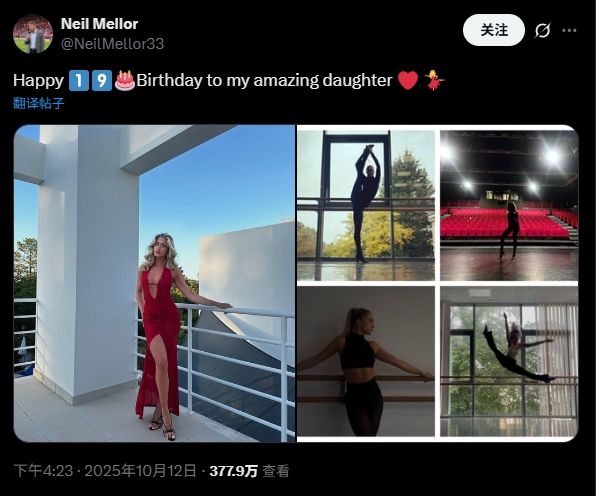 10月15日讯 近日,一则利物浦旧将尼尔·梅勒祝福女儿19岁生日快乐的动态突然爆火,单平台阅读量近400万次。